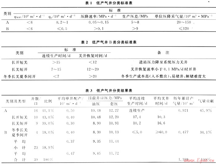 為了提高低產(chǎn)井的采氣時率和采收率,便于對氣井進(jìn)行更好地開發(fā)與管理,依據(jù)氣井的儲層參數(shù),結(jié)合生產(chǎn)動態(tài)和穩(wěn)產(chǎn)能力,對低產(chǎn)井進(jìn)行分類,實現(xiàn)低產(chǎn)井的精細(xì)管理(表1、2、3)。