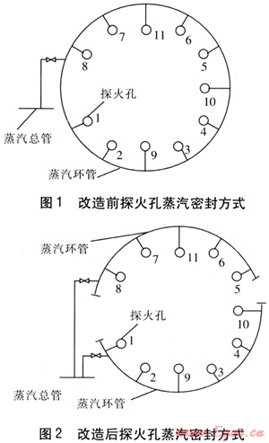 改造方案是:將原來的蒸汽環(huán)管從中間截斷成兩半,一半沿用原來的探火蒸汽管和閥門,只是將兩端用堵頭堵住,主要用來密封5、6、7、8、11號探火孔;用1根直徑為40mm的無縫鋼管從蒸汽總管引至另一半環(huán)管上,加裝1個DN 40mm的截止閥作為控制用,這一半環(huán)管主要用來密封1、2、3、4、9、10號探火孔。經(jīng)過這一改進后,提高了密封煤氣的蒸汽壓力,解決了在探火時因蒸汽壓力較低而造成密封效果較差、煤氣泄漏嚴重的問題。