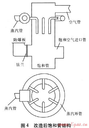 改變蒸汽進入飽和管的方式,首先在飽和管外部加1根管徑為100mm的環(huán)形管,環(huán)形管上接1段長度為200mm、直徑為200mm的緩沖管,使蒸汽在緩沖管內(nèi)得到緩沖,然后將蒸汽由6根直徑為40mm的支管引入飽和管,在每根支管上分別鉆12個直徑為14mm的孔(靠飽和管內(nèi)壁一側(cè)不鉆孔),支管末端出口用盲板堵住。改造后飽和管結(jié)構(gòu)見圖4。通過以上改造,實現(xiàn)了蒸汽和空氣的充分混合,提高了氣化劑的品質(zhì),從而改善了爐內(nèi)氣化狀況。