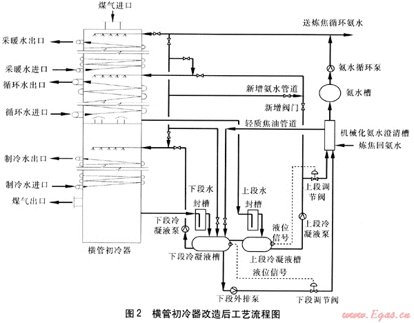 ① 在上段冷凝液泵總出口管道上增加一個閥門和循環(huán)氨水清掃管道。在冬季,將新增閥門關(guān)上,用循環(huán)氨水代替上段冷凝液對中段進行噴灑[3],中段的冷卻熱量由循環(huán)水通過涼水架換熱帶走,初冷器上、中段下來的冷凝液經(jīng)水封槽進入上段冷凝液槽,用上段冷凝液泵直接抽送到機械化氨水澄清槽,可以避免初冷器清掃下來的萘又重新進入初冷器中堵塞初冷器。在其他季節(jié),將新增閥門打開,用上段冷凝液直接對中段進行噴灑以降低煤氣溫度。