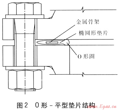 第2種結(jié)構(gòu)為O形-平型墊片,在平型墊片的斷面內(nèi)側(cè)邊緣連接有0形橡膠圈,見圖2。0形橡膠圈的直徑為橢圓形墊片厚度的1.2~1.5倍,可起到更好的密封效果。金屬骨架的橫截面為長(zhǎng)方形,嵌裝在橢圓形橡膠墊片的中心部位。推薦在1.6MPa設(shè)計(jì)壓力下使用這種結(jié)構(gòu)形式的墊片。