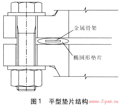 第1種結(jié)構(gòu)為平型墊片,其斷面幾何形狀為橢圓形,見圖1。當(dāng)用于天然氣管道時(shí),平型墊片表面非金屬部分可以采用丁腈橡膠等橡膠材料,并且在其中嵌裝環(huán)形金屬骨架。金屬骨架的橫截面為長(zhǎng)方形,嵌裝在橢圓形橡膠墊片的中心部位。推薦在0.4MPa設(shè)計(jì)壓力下使用這種結(jié)構(gòu)形式的墊片。