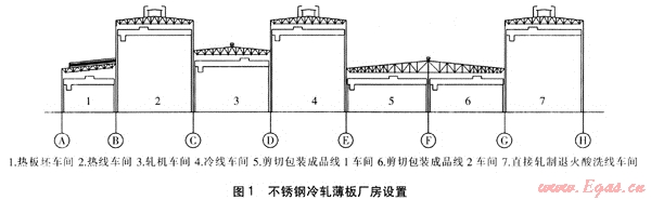 不銹鋼冷軋薄板工程占地面積約14×104m2,廠房總長度為690m,總寬度為204m,由相鄰的多跨車間組成。總建筑面積為12.861×104m2,其中熱板坯車間建筑面積為14490m2,該車間不供暖。其他車間建筑面積為11.412×104m2,為供暖區(qū)域。由于供暖區(qū)域內(nèi)包括磨輥間、變電站、成品庫等不需供暖的部位,因此為簡化問題,供暖面積按11×104m2考慮。不銹鋼冷軋薄板廠房設(shè)置及廠房內(nèi)布置分別見圖1、2。