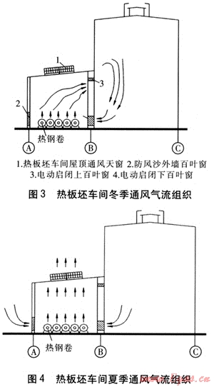 經(jīng)計(jì)算得,熱板坯車間的余熱量為53.44MW。在冬季,為充分利用該余熱,考慮在該車間加強(qiáng)氣流組織,依靠自然通風(fēng)系統(tǒng),在滿足該車間冬季室內(nèi)溫度要求外,對相鄰的熱線車間通過熱氣流組織,提供部分余熱,降低熱線車間的供暖能耗。冬夏季兩種工況下,熱板坯車間通風(fēng)氣流組織分別見圖3、4。在冬季,熱板坯車間電動啟閉上、下百葉窗開啟,屋頂通風(fēng)天窗、防風(fēng)沙外墻百葉窗關(guān)閉,熱氣流流向熱線車間。在夏季,電動啟閉上百葉窗關(guān)閉,屋頂通風(fēng)天窗開啟排風(fēng),電動啟閉下百葉窗及防風(fēng)沙外墻百葉窗開啟進(jìn)風(fēng),可將大量余熱排往室外,消除熱鋼卷散熱對熱板坯車間產(chǎn)生的高溫影響,保證現(xiàn)場工人身體健康。