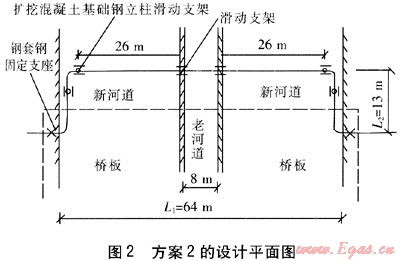 方案2為擴(kuò)挖混凝土基礎(chǔ)鋼立柱架空跨越設(shè)計(jì)方案,設(shè)計(jì)平面圖見圖2。利用老河道的河墻作為兩處滑動(dòng)支架的支撐,在河道內(nèi)新增4個(gè)擴(kuò)挖混凝土基礎(chǔ)鋼立柱滑動(dòng)支架,跨河管道采用自然補(bǔ)償方式。