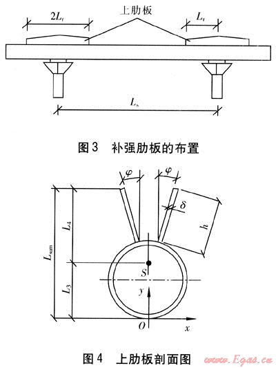 該方法通過增大管道截面系數(shù),使滑動(dòng)支架跨距增加30%~60%[4],而多消耗的金屬不會(huì)超過管子重量的10%。當(dāng)滑動(dòng)支架間距較長(zhǎng)時(shí),可以在滑動(dòng)支架處管道上方加焊肋板,肋板可用扁鋼或鋼板制成,補(bǔ)強(qiáng)肋板的布置見圖3。圖中,Ls為兩個(gè)滑動(dòng)支架之間的距離,單位為m;Lr為滑動(dòng)支架支點(diǎn)距肋板最遠(yuǎn)端的距離,單位為m,取Lr=0.1Ls。上肋板剖面圖見圖4,圖中,φ為肋板與管子截面中心垂直線的夾角,單位為(°);δ為肋板厚度,單位為m;h為肋板高度,單位為m;點(diǎn)S為管道補(bǔ)強(qiáng)后的重心,點(diǎn)O為坐標(biāo)原點(diǎn);L3為點(diǎn)S、O間距離,單位為m;L4為點(diǎn)S距肋板上端的垂直距離,單位為m;Lsum為L(zhǎng)3、L4之和,單位為m。圖4中兩側(cè)肋板軸線交于點(diǎn)S。