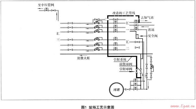 把站場(chǎng)引射器下方管線和加氣站進(jìn)氣管道連接起來(lái),關(guān)閉匯一集氣罐上到加氣站去的球閥。這樣就用球罐存氣通過引射管道供光明村加氣站運(yùn)行,球罐晚間進(jìn)氣到高壓0.92MPa,白天通過引射管線供加氣站。見圖1。