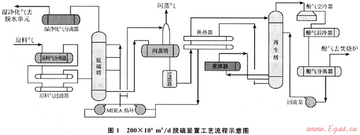 中國石油長慶油田公司所轄靖邊氣田在開發(fā)建設(shè)初期天然氣中的H2S含量平均為500mg/m3,CO2體積分?jǐn)?shù)平均為3.025%,因此,1997年建設(shè)的長慶第一天然氣凈化廠(以下簡稱一廠)有5套并聯(lián)運(yùn)行的MDEA溶液脫硫裝置,單套裝置處理能力為200×104m3/d,其工藝流程如圖1所示。