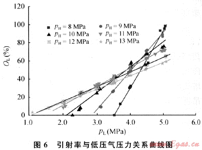 2) 低壓氣流量與高壓氣壓力非單調(diào)關(guān)系,隨著高壓氣壓力增加,低壓氣流量先增加后減小?,F(xiàn)場(chǎng)應(yīng)用并不是高壓井進(jìn)氣壓力越高越好,需要選擇合適的高壓氣工作壓力。