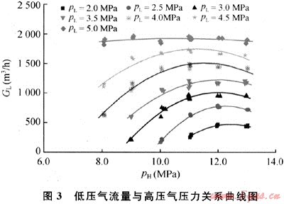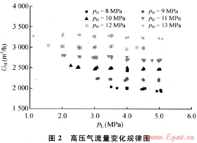 從圖3中可以看出,低壓氣流量與高壓氣壓力為非單調(diào)關(guān)系,隨高壓氣壓力的增大而先增大后減小。由該圖可知,當(dāng)高壓氣壓力(pH)為11~12MPa時(shí),低壓氣流量的變化規(guī)律發(fā)生轉(zhuǎn)變,這與裝置設(shè)計(jì)工作壓力有關(guān)。