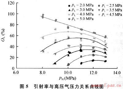 一般來(lái)說(shuō),隨著高壓氣壓力的增加,高壓氣流量增大,相應(yīng)的引射量(低壓氣流量)也增大。但當(dāng)聲。高于某特定值時(shí),隨著高壓氣壓力的進(jìn)一步增大,噴嘴出口的壓力升高,低壓氣的進(jìn)氣壓力與噴嘴出口壓力的壓差減小,從而低壓流體的引射量減少。這表明在天然氣噴射裝置實(shí)際運(yùn)行時(shí),不能靠盲目提高高壓氣的進(jìn)氣壓力來(lái)增大低壓氣流量。
