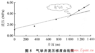 1) 第一種方法是根據(jù)油井產(chǎn)量和在油管內(nèi)測流壓梯度來分析氣舉井的注氣點(diǎn)位置,分析氣舉井是否存在多點(diǎn)注氣問題,是否按照設(shè)計(jì)的注氣深度在正常工作[5~6],其氣舉井的流壓梯度曲線見圖5。