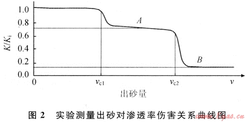 淺層氣藏地層容易出砂,在近井地層形成堆積并堵塞孔喉,造成近井地帶滲透率降低。圖2為實(shí)驗(yàn)室?guī)r心實(shí)驗(yàn)測(cè)量的出砂對(duì)滲透率傷害關(guān)系曲線。在巖石發(fā)生坍塌破壞之前,地層中游離砂產(chǎn)生的微粒運(yùn)移傷害,造成儲(chǔ)層的相對(duì)滲透率降低了25%左右(圖2中A點(diǎn))。隨著氣體流速的增加,受剪切應(yīng)力的作用儲(chǔ)層骨架遭到破壞,近井地帶大量出砂。在游離砂和骨架砂的復(fù)合作用下,儲(chǔ)層的相對(duì)滲透率降低至儲(chǔ)層原始滲透率的20%左右(圖2中B點(diǎn))[3~4]。