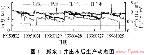 對(duì)于孤東淺層氣藏來(lái)說(shuō),底水錐進(jìn)是一種常見(jiàn)的水侵方式。水錐初期對(duì)氣井產(chǎn)能的影響一般較微弱。隨著開(kāi)采時(shí)間延長(zhǎng),水錐高度逐漸增加,水錐前沿到達(dá)近井地帶。此時(shí)射開(kāi)層上部是氣體單相流,下部為氣水兩相流,近井地帶氣相相對(duì)滲透率值降低,氣井產(chǎn)能降低。開(kāi)采后期水完全包圍近井地帶,氣井完全處于氣液兩相流狀態(tài),隨著近井地帶含水半徑和含水飽和度的增大,氣井產(chǎn)能急劇降低,嚴(yán)重情況下,氣井水淹封閉。典型井如孤東1井,圖1是該井出水后的生產(chǎn)動(dòng)態(tài)。氣井產(chǎn)水后,生產(chǎn)中套壓、油壓同時(shí)下降,關(guān)井后套壓油壓重新恢復(fù)。氣井產(chǎn)水后期套壓波動(dòng)的幅度逐漸增大,水錐加重了地層近井帶滲透狀況的劣化程度。