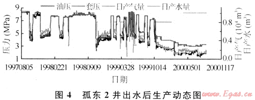 水砂復(fù)合影響相對(duì)滲透率的典型井如孤東2井。該井投產(chǎn)僅2個(gè)月就開(kāi)始產(chǎn)水。氣井雖采用先期防砂措施,但在邊底水侵入后,儲(chǔ)層近井的膠結(jié)受到影響,地層出砂,生產(chǎn)中氣井的氣嘴有刺大的現(xiàn)象。2000年油套壓加速下降,氣井關(guān)井。關(guān)井后油套壓有所回升,反映出之前的油套壓加速降低并不是地層能量衰竭所致,而是生產(chǎn)壓差增大。從氣井生產(chǎn)中套壓的波動(dòng)可以看出,隨著開(kāi)發(fā)的進(jìn)行,生產(chǎn)階段套壓下降的幅度逐漸增大,生產(chǎn)壓差增大,氣井產(chǎn)量下降,說(shuō)明水砂復(fù)合加重劣化了地層近井的滲透狀況(圖4)。
