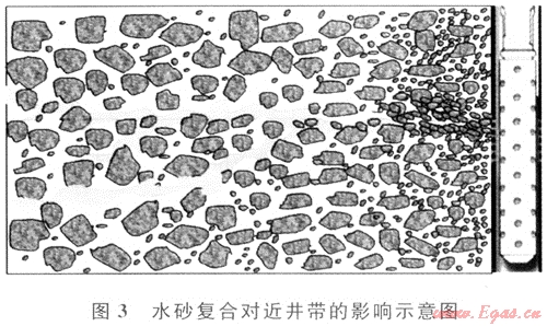 儲(chǔ)層中黏土礦物遇淡水極易膨脹和運(yùn)移,膠結(jié)變差,儲(chǔ)層易出砂。水砂復(fù)合對(duì)滲流影響劇烈。在水砂復(fù)合傷害的情況下,氣藏的絕對(duì)滲透率和氣相相對(duì)滲透率降低同時(shí)降低。如果氣井間歇關(guān)井,則近井地帶氣液兩相重新分布,從開(kāi)井生產(chǎn)時(shí)的氣液兩相同流變成液相為連續(xù)相,氣相呈氣泡狀分布在地層孔隙中。對(duì)出砂地層,在近井地層和防砂管之間一定范圍內(nèi)會(huì)形成污染帶,其中地層中粉細(xì)砂及泥質(zhì)在高含水飽和度成為非牛頓流體,重新開(kāi)井時(shí)需要啟動(dòng)壓力,在某些情況下會(huì)造成水淹氣藏(圖3)。