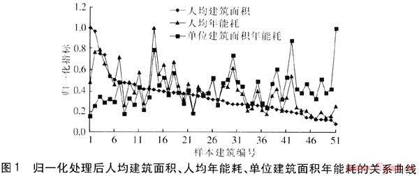 基于統(tǒng)計(jì)數(shù)據(jù)得到51幢樣本建筑的人均建筑面積、人均年能耗、單位建筑面積年能耗,為便于分析,對(duì)這3項(xiàng)數(shù)據(jù)進(jìn)行了歸一化處理。將51幢公共建筑按歸一化處理后的人均建筑面積由大到小進(jìn)行編號(hào),三者的關(guān)系曲線見(jiàn)圖1。由圖1可知,隨著人均建筑面積的增加,人均年能耗呈現(xiàn)上升的趨勢(shì),而單位建筑面積年能耗呈現(xiàn)下降的趨勢(shì)。