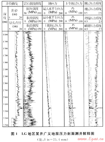 利用LG地區(qū)已鉆井的測(cè)井及實(shí)鉆資料,對(duì)某井3個(gè)壓力(孔隙壓力、坍塌壓力和破裂壓力)進(jìn)行了定量計(jì)算,建立了較完整的廣義地層壓力剖面(圖1)[1~5]。