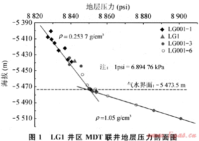 MDT在LG001-1井井深6171.19m測到1個(gè)壓力點(diǎn),測點(diǎn)處海拔-5573.78m,壓力61.2717MPa。將此海拔代入LG1井氣柱方程,計(jì)算壓力61.184MPa。用LG1井氣柱方程推算壓力比實(shí)測壓力低0.0877MPa,兩者相差較小,因此判定它們?yōu)橥粔毫ο到y(tǒng)。LG001-3井水層段測到了多點(diǎn)MDT壓力資料,與LG1、LG001-1、LG001-3井進(jìn)行多井壓力分析,分析結(jié)果表明,LG1、LG001-1、LG001-3并氣層與LG3井水層在縱向上呈較好的氣水分布規(guī)律,判定它們?yōu)橥粔毫ο到y(tǒng)。