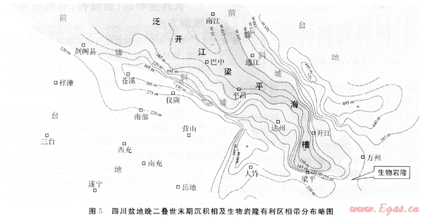 圖5是晚二疊世末期沉積相及生物礁(灘)有利區(qū)平面分布略圖,它清晰地展示出川北廣元-旺蒼海槽與川東開江-梁平海槽同屬一體,共同組成整個四川盆地的泛開江梁平海槽。該海槽呈西北向分布,上二疊統(tǒng)沉積厚度為55~165m,由川北大巴山山前廣元、南江一帶向南東到巴中、平昌沿線直至川東宣漢,于梁平附近消失,全長約320km。海槽水體由西北向東南變淺,由川北寬闊海床向川東逐漸收縮呈狹窄海灣之勢;沉積厚度隨著海槽海水向東南變淺而增厚;環(huán)海槽呈帶狀生物巖隆帶模式的生物礁(灘)有利區(qū)帶沿西岸川北劍閣-川中儀隴-川東龍會-梁平沿線附近,東岸沿川北樓子廟、川東黃金口一帶展布。整個巖隆有利區(qū)帶全長約600km。從生物礁(灘)的地震相的外貌特征看,在川中儀隴平昌及川東黃龍場、梁平等區(qū)域的礁體上隆特征較明顯。而在巖隆至海槽相之間的前緣斜坡,其形態(tài)雖然陡緩、寬窄不一,但總體上具有在北緣黃金口、黃龍場一線,在西緣梁平一帶,其斜坡狹窄、坡度較陡的基本特征。在巖隆后的廣闊水域?qū)賲^(qū)域上平坦的、沉積環(huán)境相對穩(wěn)定的臺地相。