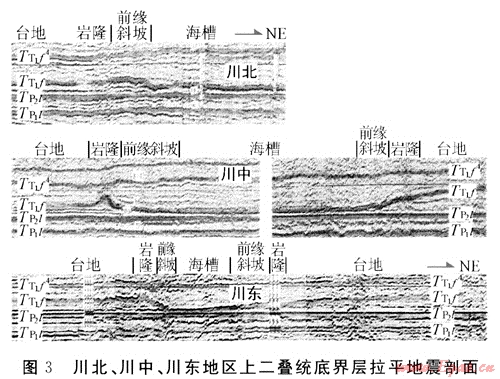 圖3是川北、川中及川東地區(qū)橫跨海槽的上二疊統(tǒng)底界層拉平區(qū)域地震剖面,可見其上二疊統(tǒng)地震相特征可分為以下4種類型:①連續(xù)、準(zhǔn)平行、厚度時差大,延伸遠(yuǎn)地震相,代表了開闊海臺地沉積;②出現(xiàn)上隆、上覆層反射結(jié)構(gòu)橫向明顯變化、窄范圍異常地震相預(yù)示了生物巖隆有利相帶;③整體呈前積反射結(jié)構(gòu)、向海盆方向呈下超地震相,屬臺地前緣斜坡相;④在深水和深水盆地區(qū),地震相展示了以連續(xù)、強振幅和朝深水區(qū)方向時差明顯減少為特征。前緣
