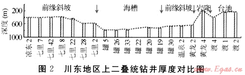 由于沉積環(huán)境不同,淺水臺地沉積速率大于深水海槽,其臺地沉積厚度明顯厚于海槽沉積存度;而在臺緣帶上,由于前積作用及各種海洋生物大量堆積所形成的碳酸鹽巖,使地層厚度增大。圖2是橫穿川東“開江-梁平”海槽相帶的上二疊統(tǒng)鉆井厚度對比直方圖,它直觀地反映出臺地厚度朝海槽方向變薄的區(qū)域前積沉積現(xiàn)象。