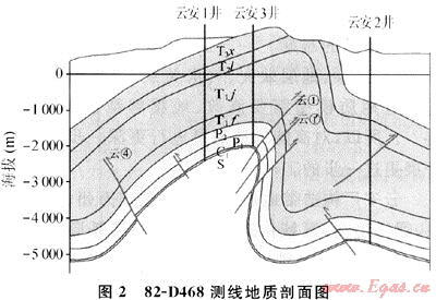 云安廠構(gòu)造中段,在云安1、2、3井實(shí)鉆剖面上,主體構(gòu)造上土城高點(diǎn)的云安3井鉆遇云1號斷層,云安2井在馮家灣潛伏構(gòu)造上。該剖面構(gòu)造形態(tài)表現(xiàn)為擠壓、抬升、上沖的構(gòu)造特征,與下盤構(gòu)造的組合關(guān)系體現(xiàn)為反“S”型構(gòu)造格局體系(圖2)。