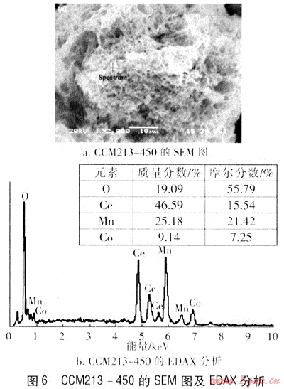 圖6為樣品CCM213-450的SEM圖及EDAX分析。由圖6a可見(jiàn),催化劑表面呈現(xiàn)蜂窩狀多孔結(jié)構(gòu),這種結(jié)構(gòu)的物質(zhì)可以有很大的比表面積及孔隙率。該多孔結(jié)構(gòu)增加了樣品的比表面積,也有利于催化反應(yīng)中吸附及氧化過(guò)程的進(jìn)行。但由圖6a可見(jiàn),表面孔徑分布不均,可能與焙燒過(guò)程中升溫速率過(guò)快有關(guān)。圖6b為樣品的EDAX分析,Ce、Co、Mn、O這4種元素的物質(zhì)的量比基本滿足了2:1:3:7.5的關(guān)系。