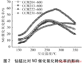 圖2考察了鈷錳比(此處指鈷錳物質(zhì)的量的比,簡(jiǎn)稱為鈷錳比)對(duì)NO催化氧化轉(zhuǎn)化率的影響。由圖2可知,當(dāng)Ce、Co、Mn物質(zhì)的量的比為2:1:3,反應(yīng)溫度為282℃時(shí),催化氧化轉(zhuǎn)化率最高,達(dá)到58%;其他3個(gè)樣品的轉(zhuǎn)化率則相對(duì)較低。隨著錳含量的增加,催化劑的最高催化活性也有所增強(qiáng),但繼續(xù)增加錳而減少鉆時(shí),催化劑的催化氧化活性在一定程度上又降低,表明了鈷錳具有協(xié)同效應(yīng),且1:3為該效應(yīng)的最佳比例。值得注意的是,當(dāng)Ce、Co、Mn物質(zhì)的量的比為2:3:1時(shí),NO催化氧化轉(zhuǎn)化率隨溫度升高后下降較慢,表現(xiàn)出該催化劑具有一定的溫度適應(yīng)性。