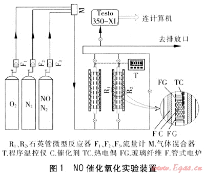 目前,NOx的主要來(lái)源為電廠、供熱鍋爐煙氣及汽車尾氣,且90%~95%為NO[1、2]。應(yīng)用于NOx脫除的各類方法包括:選擇性催化還原法(SCR)、連續(xù)再生捕集(CRT)、NOx儲(chǔ)存與還原(NSR)及濕法脫硝等,這些方法的共同點(diǎn)為在NOx脫除時(shí)NO2比NO具有更高的活性[3~5]。因此,如能將NO選擇性催化氧化為NO2,對(duì)于各類脫氮方法都將是一項(xiàng)重要的貢獻(xiàn)。根據(jù)NO與O2的化學(xué)反應(yīng)方程及反應(yīng)機(jī)理[6]可知,該反應(yīng)在熱力學(xué)上是可行的,但在常溫下,由于NO的弱極性及化學(xué)性質(zhì)的穩(wěn)定性,它們的反應(yīng)速度非常緩慢。NO選擇性催化氧化過(guò)程是指在催化劑及一定的反應(yīng)溫度下,將NO催化氧化為NO2,然后根據(jù)不同的脫除方法選擇不同的操作方式。如濕法脫硝過(guò)程,當(dāng)氧化度提高到50%~60%時(shí),液相吸收劑(如腐植酸鈉、氨水及Na2CO3)對(duì)NOx將取得最佳吸收效率[2]。