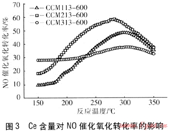 針對(duì)NO催化氧化的重要性,國(guó)內(nèi)外學(xué)者開展了積極的研究,其中以貴金屬Pt、Pd催化劑的轉(zhuǎn)化效率較高,300℃時(shí)轉(zhuǎn)化率接近90%[7~9]。我國(guó)貴金屬資源相對(duì)匱乏且造價(jià)高昂,主要用于汽車尾氣處理,而大型煙氣處理裝置則難以實(shí)現(xiàn)。近年來(lái),以過(guò)渡金屬為活性主體的新型催化劑引起了國(guó)內(nèi)外學(xué)者的重視,并進(jìn)行了大量研究[10~12]。我國(guó)的稀土儲(chǔ)量位居世界第一,將各類稀土元素應(yīng)用于催化領(lǐng)域已有大量報(bào)道,其中以La、Ce應(yīng)用較多。以CeO2為例,由于其強(qiáng)大的儲(chǔ)存和釋放氧的能力,已被應(yīng)用到多個(gè)催化方向(如CO催化氧化)[13]。