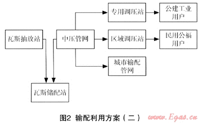 大中型煤礦瓦斯抽采一般分高低濃度兩套抽放系統(tǒng),這樣為高低濃度瓦斯的利用提供了有利條件。其中35%~45%高濃度瓦斯可以供應礦區(qū)的民用、營業(yè)福利炊事、洗浴爐、燃氣鍋爐、熱風爐、工業(yè)爐窯等的自用氣,同時將大量的剩余瓦斯接入城鎮(zhèn)儲配、輸配系統(tǒng),供應城市各類燃氣用戶用氣。輸配利用方案見圖2。