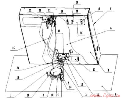圖中所示:1、噴嘴,2、引射管,3、爐頭,4、櫥柜臺面或桌面,5、灶具主殼體,6、后殼面,7、前殼面,8、孔,9、鍋架,10、爐頭支撐架,11、轉(zhuǎn)軸固定架,12、轉(zhuǎn)軸,13、電動機,14、上限位開關(guān),15、下限位開關(guān),16、控制電路板,17、電源輸入控制開關(guān),18、連接件,19、上升開關(guān),20、下降開關(guān),21、旋塞閥,22、旋鈕,23、脈;中點火器,24、點火針,25、分氣管,26、分氣管接頭,27、熱電偶式熄火保護裝置,28、進氣管。