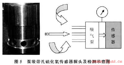 研究認為,最好選擇膜片四周都有透氣膜或透氣孔的傳感器,這樣即使在無風(fēng)的情況下周邊的硫化氫也容易進入測量探頭,有風(fēng)的時候效果更好。這種多向測量的改進,很好地保證了測量的及時性,傳感器內(nèi)部再加上泵吸,效果則更為理想。圖5所示的是目前國內(nèi)廠家生產(chǎn)的一款四周帶孔的泵吸式硫化氫檢測傳感器。