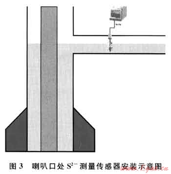 主要存在H2S、HS-、S2-3種形式。鉆井液pH值升高,S2占的比例就相應(yīng)變大,同時如果硫化氫跟強堿相比量很少,主要形成的也是S2-形式,因此初次進入井筒的硫化氫主要形成的是S2-形式。在普光氣田鉆井液的pH值一般介于9.5~10.5,故可以通過測量喇叭口處泥漿里的含S2-的情況,結(jié)合大氣環(huán)境的硫化氫監(jiān)測值,對井場硫化氫情況進確定,尤其對剛剛進入井筒的硫化氫,這種測量克服了目前井場只測大氣中硫化氫的缺點。目前國內(nèi)已有成熟的S2-在線實時監(jiān)測傳感器(圖3)。