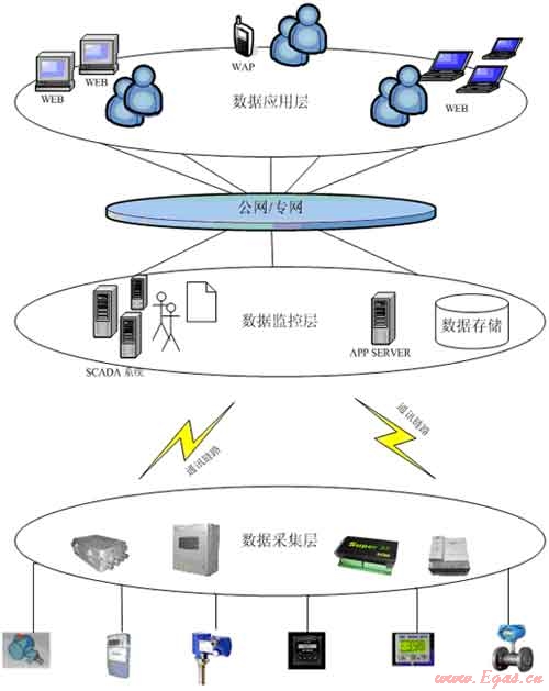 通用SCADA系統(tǒng)可分為3層。第1層為數(shù)據(jù)采集層,由RTU與一次儀表構(gòu)成,完成現(xiàn)場原始數(shù)據(jù)的采集與預(yù)處理。根據(jù)設(shè)計需求還可以實現(xiàn)現(xiàn)場的數(shù)據(jù)存儲,以保證通訊中斷后數(shù)據(jù)的連續(xù)性;第2層為數(shù)據(jù)監(jiān)控層。在這層將利用各種軟件遠程仿真現(xiàn)場,實現(xiàn)數(shù)據(jù)的實時監(jiān)控、實時報警。該層可根據(jù)對應(yīng)的管理模式再分為分控中心、總控中心等,還可根據(jù)設(shè)計需求進行大量歷史數(shù)據(jù)的存儲;第3層為數(shù)據(jù)應(yīng)用層。在應(yīng)用層實現(xiàn)對已采集數(shù)據(jù)的分析、整理,并根據(jù)需要實現(xiàn)多種形式的發(fā)布。業(yè)界很多公司分別在數(shù)據(jù)采集層、數(shù)據(jù)監(jiān)控層、數(shù)據(jù)應(yīng)用層都擁有極其穩(wěn)定的產(chǎn)品和豐富的系統(tǒng)集成經(jīng)驗。