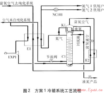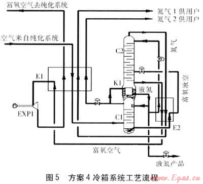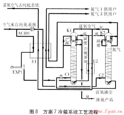 在C1底部產(chǎn)生的富氧液空經(jīng)E2過冷,節(jié)流后進入C2進行二次精餾,得到產(chǎn)品氮氣經(jīng)E2、E1復(fù)熱后作為氮氣1供用戶。得到富氧空氣經(jīng)E2復(fù)熱,進入E1被復(fù)熱到約-145℃后,送入EXP1膨脹制冷后,返回E1被復(fù)熱后,送入純化系統(tǒng)。