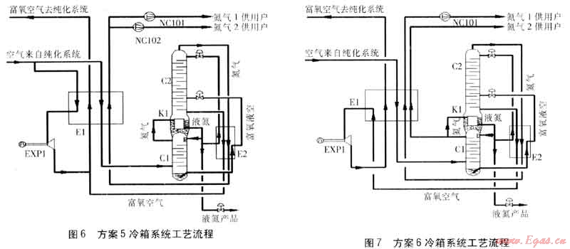 出純化系統(tǒng)的空氣進入冷箱系統(tǒng),由于冷箱系統(tǒng)隨著方案不同變化較大,因此,以下各方案的工藝流程及方案敘述只針對不同的冷箱系統(tǒng)進行介紹。