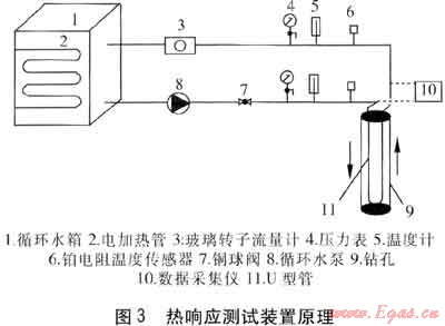 熱響應(yīng)測試原理是對地埋管中的循環(huán)水進行持續(xù)的恒熱流加熱,根據(jù)U型管進出口水溫隨時間的變化規(guī)律計算出巖土的熱物性參數(shù)。