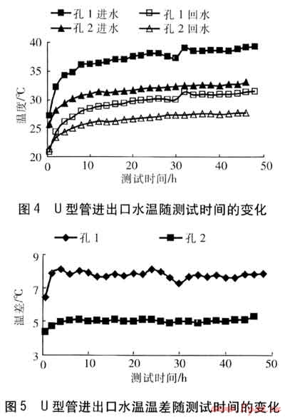 孔1、2進出口水溫、進出口水溫溫差隨測試時間的變化分別見圖4、5。