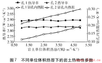 ④ 基于線熱源模型和雙參數(shù)估計法,巖土的單位體積熱容對熱導(dǎo)率幾乎沒有影響,對鉆孔內(nèi)熱阻有一定影響。