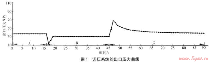 緩沖管道容積的設(shè)置通常有兩種方法:一種是過盈計(jì)算方法,需結(jié)合供氣電磁閥的開啟時(shí)間、噴火設(shè)備的用氣量、噴火設(shè)備的熄火壓力、調(diào)壓系統(tǒng)的響應(yīng)時(shí)間和調(diào)壓器的流量系數(shù)等綜合計(jì)算,并考慮一定的管道容積余量。另一種是實(shí)驗(yàn)驗(yàn)證方法,即在實(shí)驗(yàn)室模擬實(shí)際情況來驗(yàn)證管道容積是否能滿足使用要求。例如:在香港海洋公園大型噴火項(xiàng)目中,已知噴火設(shè)備的最大用氣量為6000m3/h,受場地限制,噴火設(shè)備下游為長30m、公稱直徑為250mm的緩沖管道。為驗(yàn)證此管道容積是否能滿足使用要求,特進(jìn)行實(shí)驗(yàn)驗(yàn)證。通過在上海飛奧燃?xì)庠O(shè)備有限公司閥門與調(diào)壓實(shí)驗(yàn)室進(jìn)行的模擬試驗(yàn),得到了調(diào)壓系統(tǒng)的出口壓力曲線,見圖1中的A、B段。