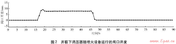 為了測量雙路調(diào)壓器供氣時(shí)的閥口開度是否均衡,我們采用了激光測位儀,對(duì)調(diào)壓器的運(yùn)動(dòng)行程進(jìn)行同步測量。根據(jù)調(diào)壓器位置不同,分為并聯(lián)上調(diào)壓器和并聯(lián)下調(diào)壓器,并聯(lián)下調(diào)壓器隨噴火設(shè)備運(yùn)行的閥口開度見圖2,圖2與圖1在時(shí)間上相對(duì)應(yīng)。