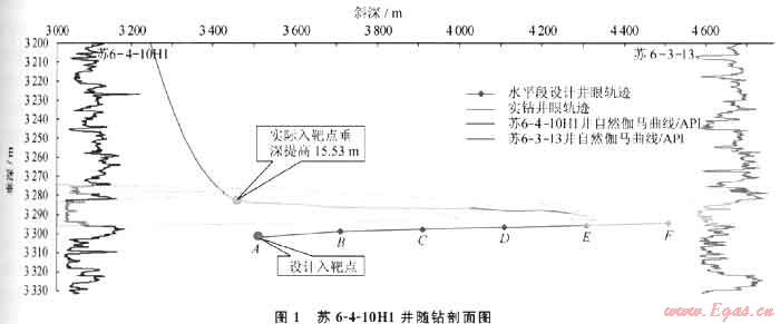 如果設(shè)計靶點低于實際目標(biāo)層,在有效地層厚度范圍內(nèi)井斜角達不到工程入靶技術(shù)要求,則存在鉆刻目標(biāo)層、填井重鉆風(fēng)險。典型井蘇6-4-10H1,設(shè)計靶點在預(yù)測目標(biāo)層以下15.53m,發(fā)現(xiàn)后及時上調(diào)入靶點,最終使該井成功入靶(圖1)。