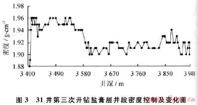 圖3所示為2010年3月31井在第三次開鉆鹽膏層井段(3400~3937m)的密度控制情況。31井第三次開鉆鹽膏層井段初鉆時(shí)密度控制在1.95g/cm3左右,進(jìn)入井深3580m后根據(jù)實(shí)際情況逐步降低了鉆井液密度,合理、適當(dāng)?shù)恼{(diào)整密度范圍以達(dá)到“近平衡鉆井”,不僅給鉆井液日常維護(hù)帶來了便利,而且明顯提高了鉆井速度、縮短了鉆井周期(第三次開鉆鹽膏層用時(shí)僅30d),很好地實(shí)現(xiàn)了快速、安全、高效的鉆井目標(biāo)。