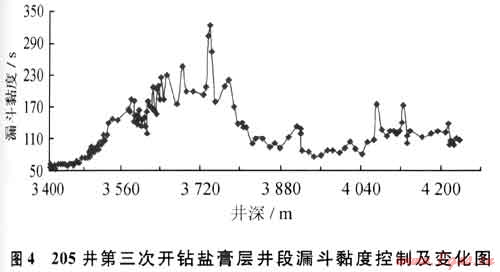 將“護(hù)膠為主、降黏為輔”作為調(diào)控各項(xiàng)性能的指導(dǎo)原則;適當(dāng)降低井漿中的膨潤(rùn)土含量,以降低其發(fā)生各種污染的可能性。高密度飽和鹽水鉆井液由于其密度高、固相含量大,體系本身所固有的固相容量限已被壓縮至一個(gè)很窄的范圍,一旦進(jìn)入體系的劣質(zhì)固相(如鉆屑粉末、泥巖細(xì)顆粒等)來不及清除,累積到一定程度若其超過體系固相容量上限時(shí),各種固相粒子極易連接形成結(jié)構(gòu),導(dǎo)致鉆井液的黏度和切力增加,從而也會(huì)以污染形式表現(xiàn)出來[3~5]。如2009年3月205井在第三次開鉆鹽膏層井段(3402~4237m)鉆進(jìn)過程中所發(fā)生的情況(圖4)就是如此,具體表現(xiàn)為鉆井液“黏土固相侵”,黏切劇增,流變性能失穩(wěn)。