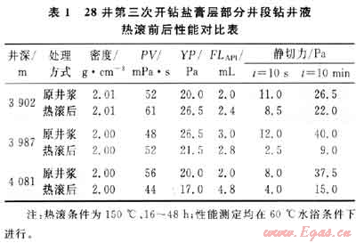 28井在第三次開鉆鹽膏層期間除采用高濃度(5%~8%)SMP和SMC三磺材料膠液外,性能維護(hù)時(shí)還不斷補(bǔ)充FT-1A、PAC等護(hù)膠劑進(jìn)入體系。表1為28井第三次開鉆鹽膏層部分井段鉆井液在150℃熱滾前后性能變化對(duì)比表。不同井段鉆井液經(jīng)過150℃熱滾后,鉆井液各項(xiàng)性能保持穩(wěn)定,甚至出現(xiàn)了性能越熱滾越好的現(xiàn)象。這是黏土高溫水化分散和處理劑護(hù)膠作用相互抵消和補(bǔ)償后的綜合結(jié)果;此現(xiàn)象同時(shí)也說明盡管黏土受到高溫水化分散后使其顆粒濃度相對(duì)增加,但由于鉆井液內(nèi)有足量的護(hù)膠劑吸附在其顆粒上面,致使黏土顆粒之間不能發(fā)生“面-面”形式的聚結(jié),從而穩(wěn)定了鉆井液的整體性能。