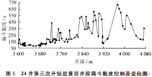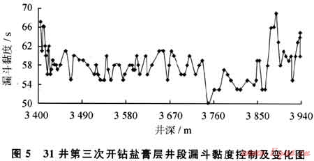 采取的具體措施包括:維持體系較低的堿性(即pH值一般保持在8~9);適當(dāng)放大量以膠液形式補(bǔ)充各類處理劑進(jìn)入體系以維護(hù)鉆進(jìn)過程中材料的正常消耗;在井漿中不斷補(bǔ)充NaCl甚至到飽和以提高其整體抑制性;補(bǔ)充KCl至一定量以形成對(duì)黏土質(zhì)成分應(yīng)有的抑制效果等。圖5為31井第三次開鉆鹽膏層井段漏斗黏度控制及變化情況,由于加強(qiáng)了對(duì)鉆井液整體抑制性的維護(hù),鉆井液流變性能明顯較好。