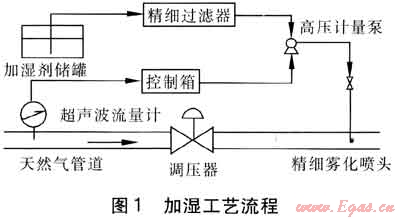 結(jié)合青島市燃?xì)夤芫W(wǎng)的實(shí)際運(yùn)行情況,自行設(shè)計(jì)了噴霧加濕工藝流程,見(jiàn)圖1。