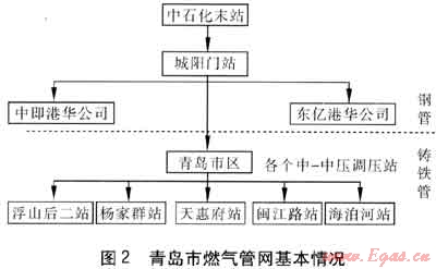 青島市燃?xì)夤芫W(wǎng)的基本情況見(jiàn)圖2。市區(qū)所使用的天然氣主要來(lái)自中石化末站,經(jīng)過(guò)城陽(yáng)門(mén)站計(jì)量后,分別供給青島市區(qū)、中即港華公司和東億港華公司。中即港華公司和東億港華公司所建管網(wǎng)全部采用鋼管,不存在接口漏氣現(xiàn)象,因此不需要加濕。進(jìn)入市區(qū)的天然氣先經(jīng)過(guò)21km輸氣管道后分到各中-中壓調(diào)壓站,經(jīng)調(diào)壓后進(jìn)入中壓B管網(wǎng)。這21km輸氣管道也全部是鋼管,因此也不存在接口漏氣現(xiàn)象。